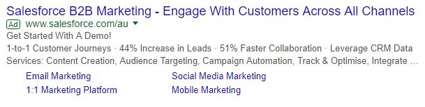 When Googling B2B marketing, you get this ad, which states specifics such as 44% increase in leads and 51% faster collaboration. This ad was far more engaging than the others which did not include any promising figures.