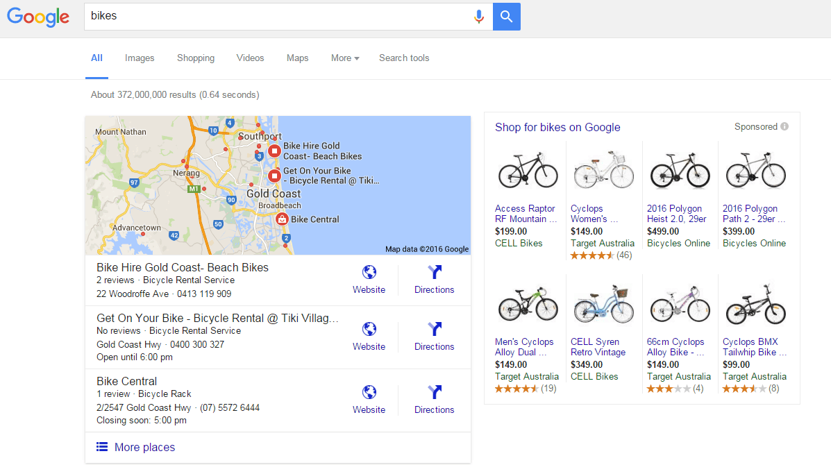But what about all that other space. You know, off to the right there where nobody used to look. What’s it going to be used for now? Technically, it will still feature ads, but they will be a very different form of ad to what came before. PLAs, or Product Listing Advertisements, will be featured on the right hand side of the results featuring sponsored links to products related to the search term. For instance if you search “bikes” you may be presented with PLAs of bikes from various sellers around the web.