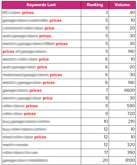 As you can see in the table below, we organized the lost keywords in terms of previous rank as well as search volume according to Google’s Keyword Planner. After the list was made it became glaringly obvious what the problem was. Price based keywords made up 75% of the keywords lost from March to April. Given the average search volume, previously solid ranking position of the client and the Click-Through-Rate of these positions, it was a safe assumption that is was the cause of the lack of traffic.