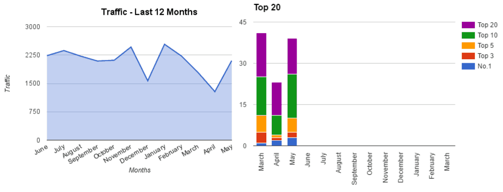 As part of our monthly reporting we provide our clients with a visual representation of traffic as well as a breakdown of the keywords of which are ranking in the top 20. Below are the two graphs for this client that sparked the investigation.