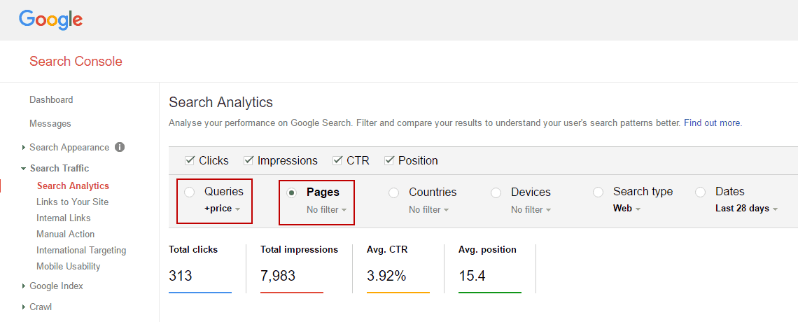 To further understand why we lost these keywords we first needed to know what page was ranking for these keywords. To do this we used Google Search Console’s Search Analytics and filtered queries by ‘price’ and search by page. 99% of these lost keywords were heading to the Price Guide page.