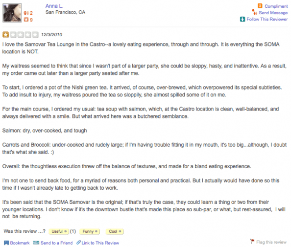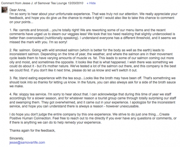 Remember when you’re responding that you should remain calm and understanding. You don’t want to end up in a fight with the reviewer. Try and put yourself in the reviewers shoes and understand where they’re coming from. If you go on the defensive, you risk damaging your reputation, as well as losing the customer forever. Often, a simple apology will suffice, and the customer will want to shop with your brand again. Check out this review of Samovar Tea Lounge in San Francisco for an example of a professional response which answers all of the reviewers points: