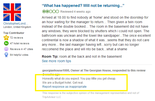 There are exceptions to this rule. If someone is trolling, a frequent complainer, or using lots of offensive language, it is often better to simply remove the reviews.