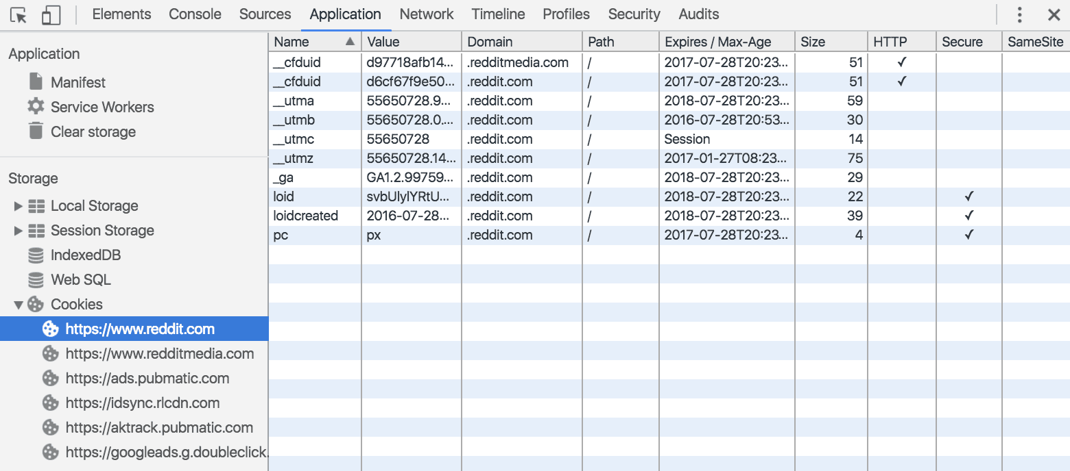 The Application panel allows for you to view detailed information about a cookie, as well as delete cookies.