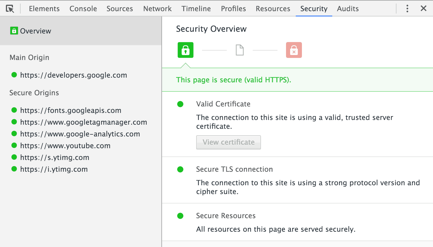 The Security overview tells you whether your page is secure, and whether it has a secure connection and resources. Clicking on the “view certificate” button allows you to view the server certificate for the main origin. A non-secure page will read the message ‘this page is not secure.’ You can also use the left hand panel to inspect individual secure or non-secure origins. Clicking on any non-secure links will give you details on which request from that origin was served over HTTP.
