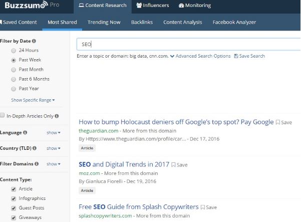 Typing “SEO” into the search bar should present you with a list of trending SEO content alongside their social media engagement, number of links and total shares. You can also filter each search by date, country and content type (for example, article, guest post).