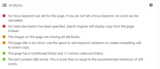 The plugin helps you to make your page more SEO friendly by presenting users with green circles. The colors work the same way as traffic lights - green is good, orange is average, and red is bad. After each colored circle there is a description of the task, and if it is not green, what you can do to improve it.