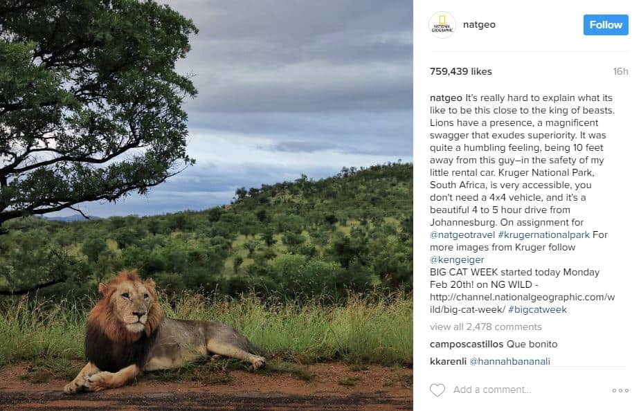 No longer just a print magazine, National Geographic has completely embraced new technology and taken advantage of Instagram. It boasts an impressive 70 million followers. The brand posts several photos and videos a day - all in the high quality you expect from National Geographic. The captions always mention where you can go to see more from the photographer, so followers will never be unsatisfied. The bio even includes a link to National Geographic’s photography page. If you’re wanting to see some amazing wildlife photography, look no further than National Geographic.