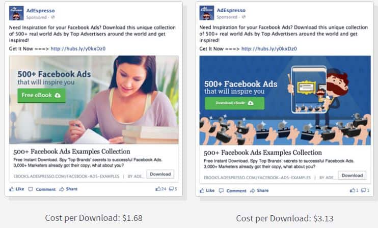 If you’re only ever running one advertisement, you’ll never know if you could have more success if the ad looked different. That’s where A/B testing comes in. This allows you to test different ads and measure the results. The best way to approach A/B testing is by first changing the images. Choose a minimum five different images, and note which one has the most response. From there, you can refine elements such as headers and text. This way, you’ll have a better understanding of ads your customers are responding to, and won’t have to spend money on ads that aren’t producing results. AdEspresso found they had success testing two different ads, and were able to find which option worked best, and saved a ton of money in the process: