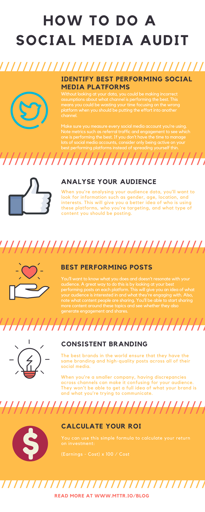 Undertaking a social media audit allows you to see what’s working, what’s not and how and where you can improve. You want to know if you have a positive return on investment (ROI) and whether you’re meeting your social media goals. To make sure you’re not wasting your money or time, you should complete a social media audit.