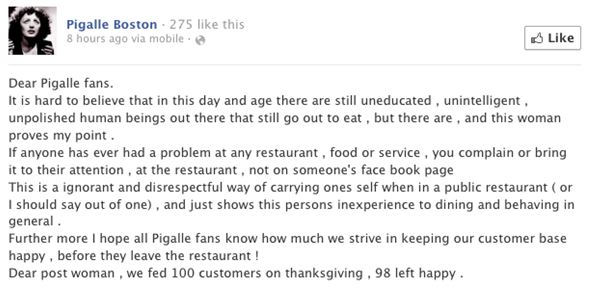 The chef of Boston restaurant Pigalle learned this lesson the hard way, after a customer left a complaint on their Facebook page. The negative comment not only received a rude response, but caused an angry status to be posted as well: