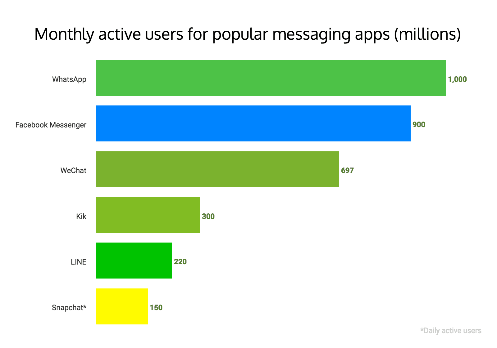 Looking at monthly active users quickly tells you which messaging apps are the most popular.