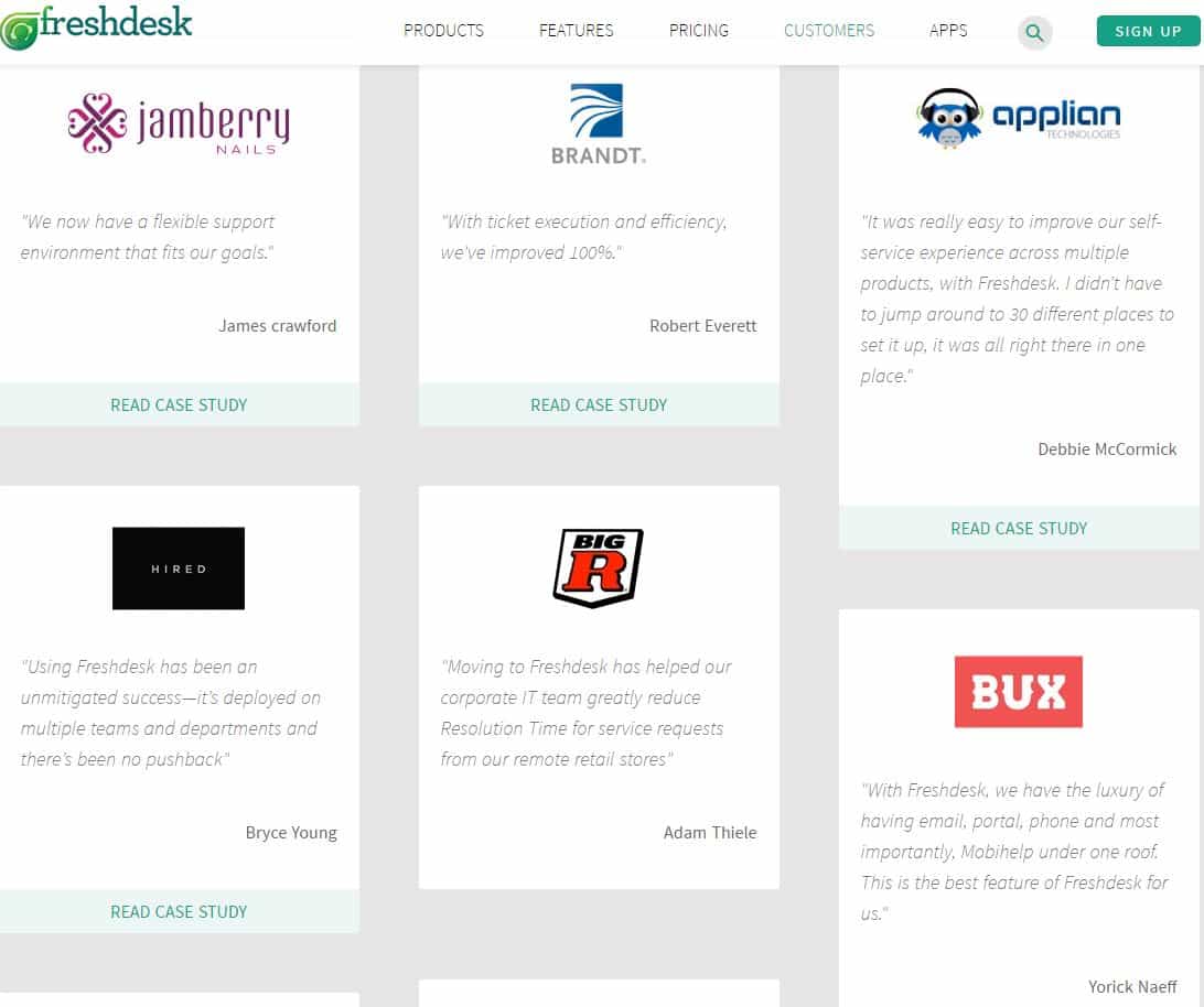 Freshdesk has a page dedicated to testimonials, with the logos of customers included, and written testimonials from many happy customers: