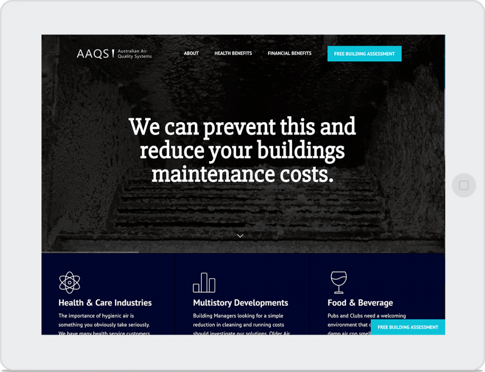 The solution they needed was a landing page, built on WordPress with flexible content blocks that would allow for further landing pages to be generated for targeted Paid Media advertising campaigns. There was a lot of work to be done so that the benefits AAQS services provide were clearly shown in vibrant content blocks, and a prominent "Free Building Assessment" floating-call-to-action button as a key conversion goal focus, and we were only too happy to aid them in this aspect.