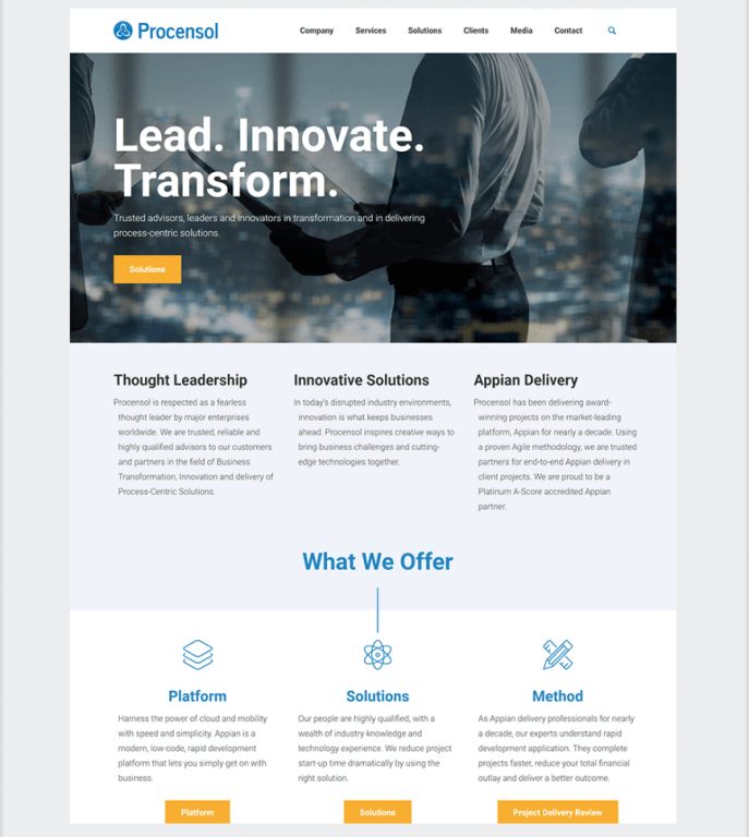 The new design is professional and modern, aligns to the brand and lets the content stand out in the right places and in the right ways. The home page content hierarchy is clearly defined and allows visitors to find information about the services & solutions they are looking for easily and quickly, while also confirming the identity and capabilities of the Procensol upfront.
